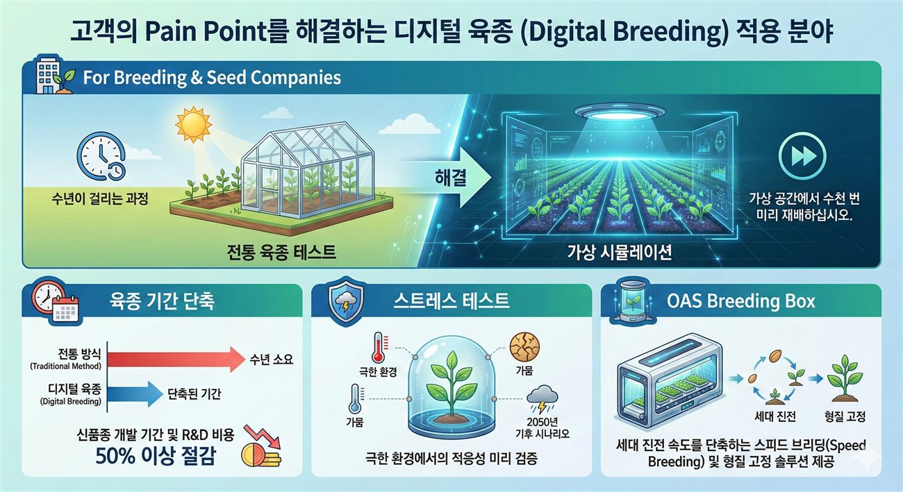 - 육종 기간 단축: 가상 시뮬레이션을 통해 신품종 개발 기간 및 R&D 비용 50% 이상 절감.