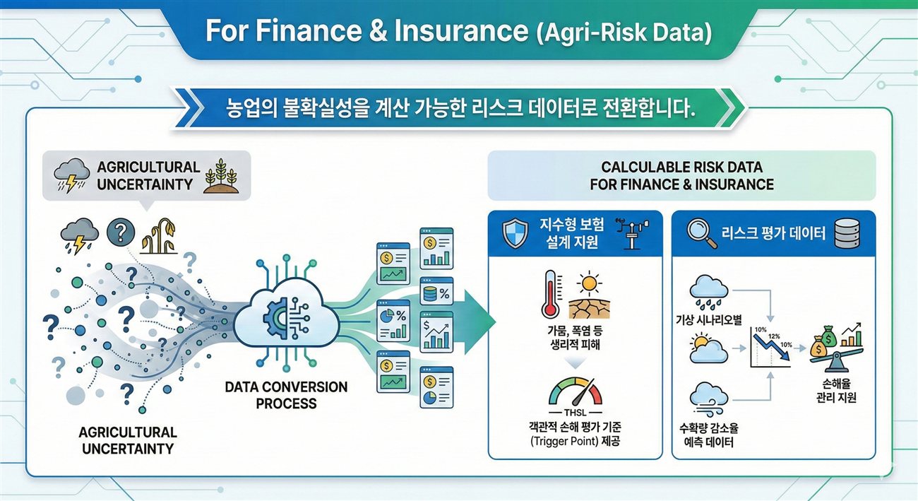 - 지수형 보험 설계 지원: 가뭄, 폭염 등 생리적 피해에 대한 객관적 손해 평가 기준(Trigger Point) 제공.